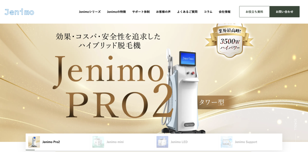 ジェニモ(Jenimo)は、美容業界向けの総合美容機器メーカーで、業務用脱毛機や痩身機、美顔機などを開発・製造しています。