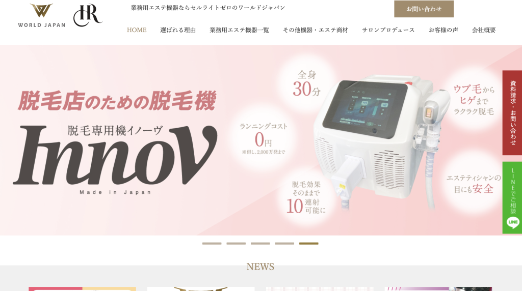 ワールドジャパンも、同じく国内大手の美容機器メーカー。特に注目を集めているInnovは次世代型LED脱毛機として近年リリースされました。