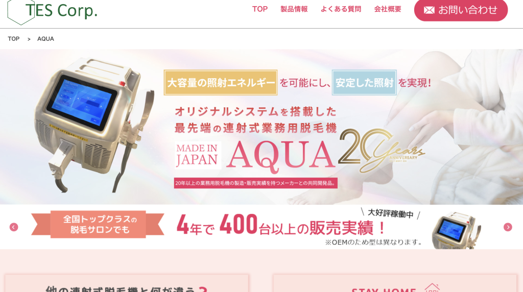 TESコーポレーションが展開するAQUAは純国産の業務用脱毛機として、安心安全の光脱毛を提供しています。