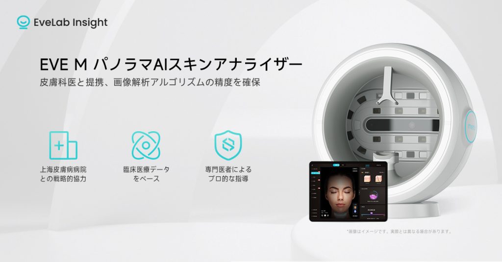 そんな肌診断の中でも注目を集めているのが、EveLab Insight社が開発したAI肌分析機「EVE M」です。EVE Mはお客様の肌をわずか数秒で撮影し、目に見えない肌の奥の状態まで解析できるパノラマAI肌診断機です。